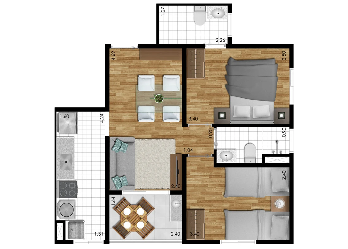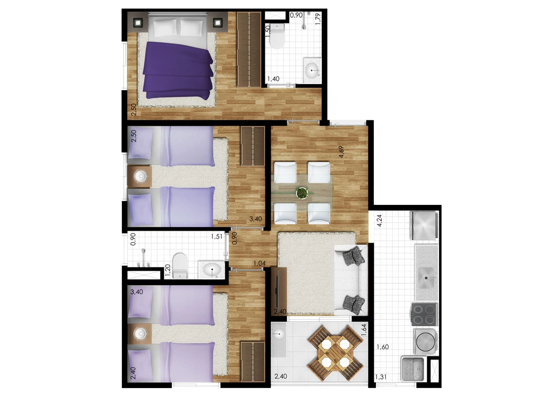 3 dorms. (opção com suíte) e 2 dormitórios